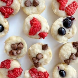 I highly recommend making these in a mini muffin tin, not a regular size! Just remember, these are pancake bites, not muffins, so they won’t have the exact same super fluffy texture that muffins have. They don’t rise as much, but are perfect for dipping. They are also good by themselves! As they have no sugar and are just sweetened with banana, the mix-ins are essential in making these taste amazing. These are a simple, 3 ingredient, no egg, pancake bite. I hope you enjoy!