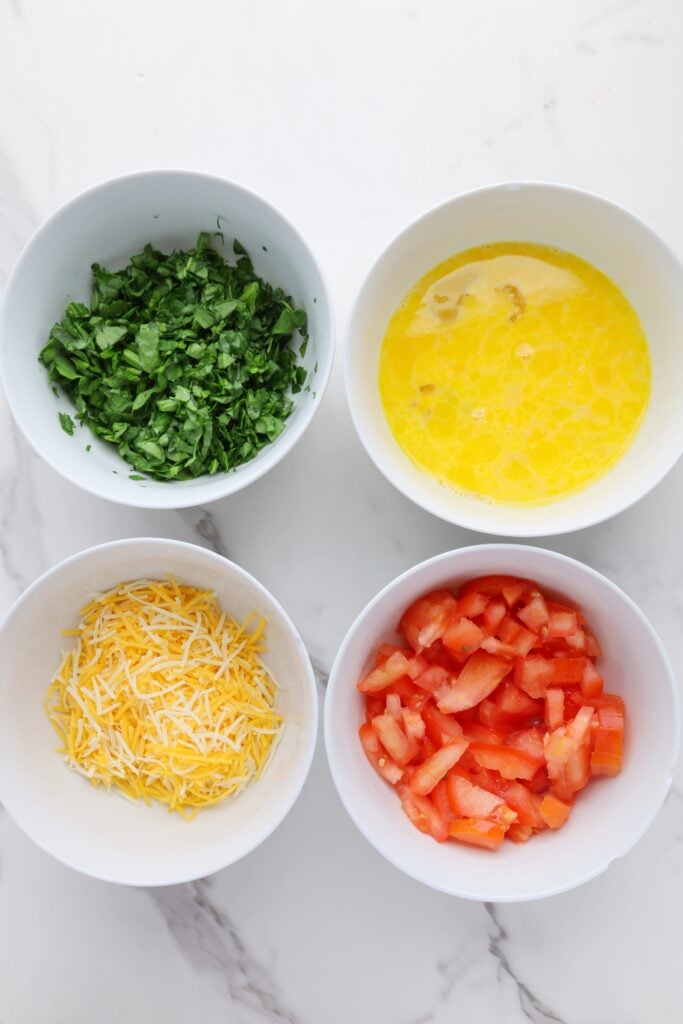 - Add chopped spinach, diced tomato, shredded cheese, and eggs (whisked) into a bowl.